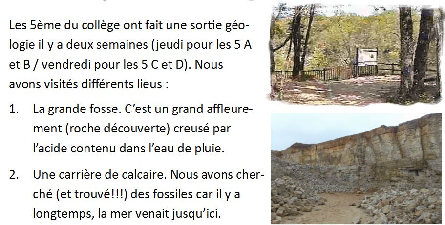 Les 5ème du collège ont fait une sortie géologie il y a deux semaines (jeudi pour les 5 A et B / vendredi pour les 5 C et D).